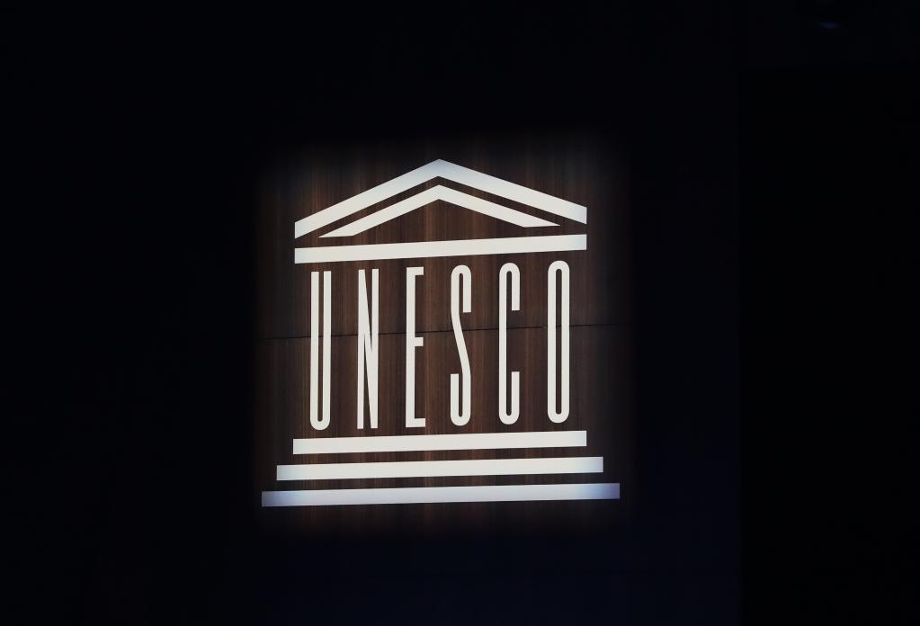 这是2021年11月12日在法国巴黎举行的联合国教科文组织成立75周年庆典活动上拍摄的联合国教科文组织标识。新华社记者高静摄