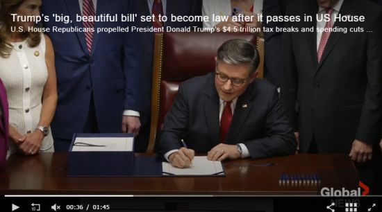 共和党占优的众议院周四以218票赞成、214票反对的结果通过了“大而美法案”(One Big Beautiful Bill Act),此前经过数小时的持续施压和审议,其中包括众议院236年历史上最长的一次会场发言和程序性投票。特朗普表示,将于当地周五下午4时举行庆祝活动,下午5时签署法案,使之成为法律。