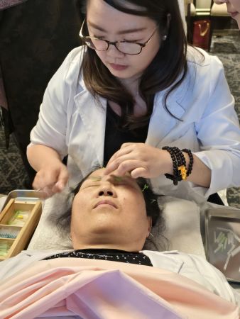 BC省中医雷射针灸与美容医学会副理事长唐红在现场展示刮痧按摩美容。刮痧是一种中国古老的民间疗法,通过在皮肤上施加一定压力来促进血液和「气」的流动。所谓的「刮痧按摩」是指使用符合脸部轮廓的刮痧板,轻轻地在皮肤上摩擦。这种调理皮肤的方式已经获得西医界的肯定。另一名中医师 Jackie Lin 则大秀目前很流行的「韩式美颜针」。