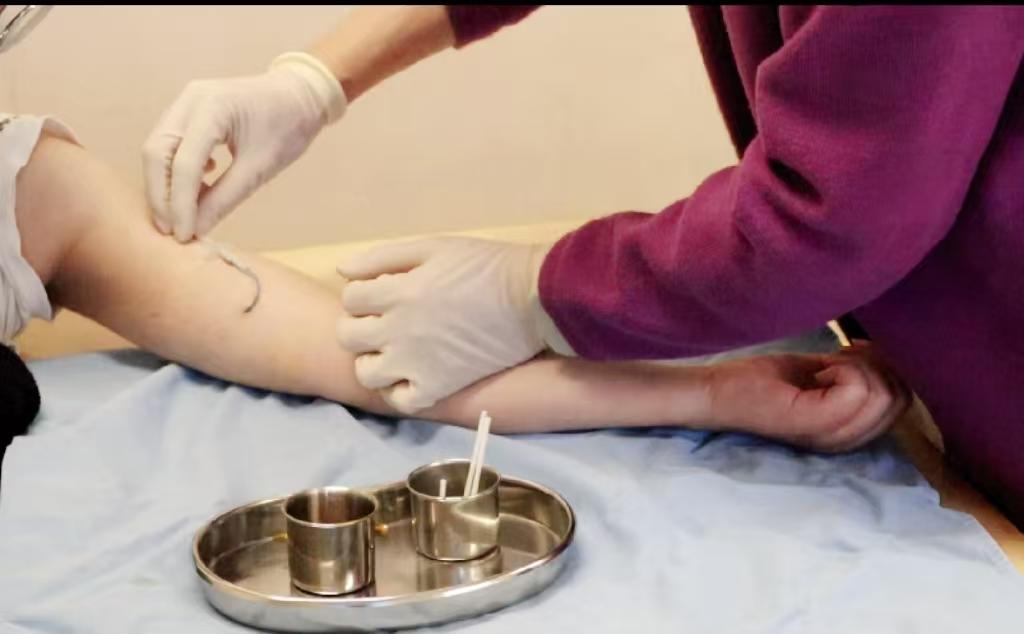 北京协和医院临床营养科护士长孙文彦正在为患者进行经外周静脉穿刺中心静脉导管(PICC)置管。新华社记者徐鹏航 摄