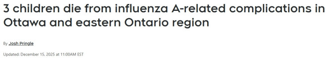 渥太华公共卫生局(Ottawa Public Health)周一上午发布声明称,在12月前两周,渥太华及东安省卫生局(Eastern Ontario Health Unit)辖区内,已有3名年龄在5至9岁之间的儿童因甲型流感并发症死亡。