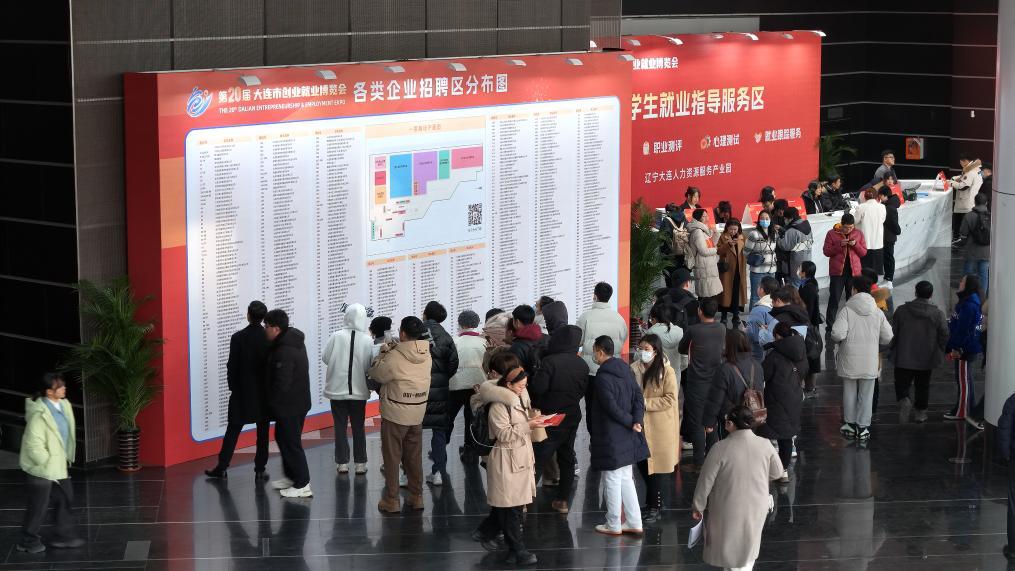 3月2日,在大连市春季人才招聘暨大中专毕业生就业洽谈会现场,求职者在查看招聘企业展位分布图。新华社发