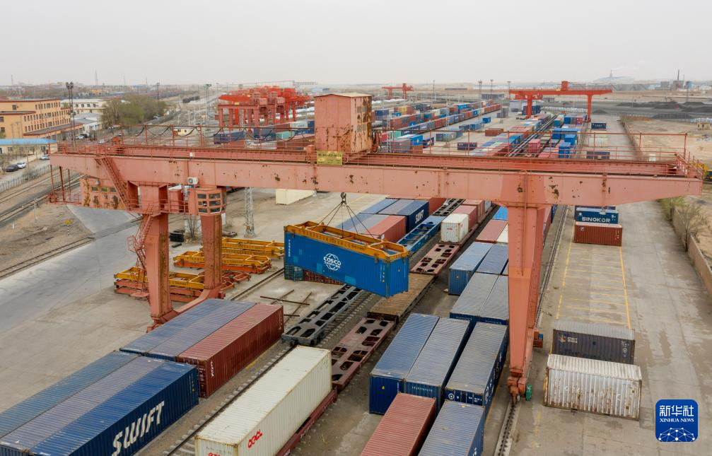 4月21日,二连浩特铁路口岸龙门吊吊装中欧班列集装箱(无人机照片)。 新华社发(张海峰摄)