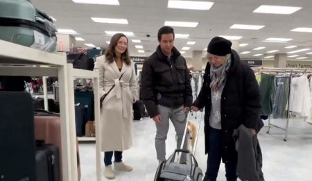 塞尔比(Timothy Selby,中间)和奥尔德斯(Jennifer Aalders,左一)带着乔伊(右一)选购圣诞礼物。Global News视频截图