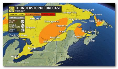 预计周二夜间,安大略省西南部地区将开始下大雨,然后它将继续向东移动。周三早上,大多伦多地区(GTA)的居民将会在降雨中醒来,周三下午,雨水将到达魁北克南部。多伦多市周二下午已发布降雨警告:“:降雨可能达到 40 至 60 毫米,局部地区可能更高。虽然对此次天气系统确切路径的信心较低,但这些类型的系统在历史上以暴雨的形式产生了非常高的降水率。”政府敦促居民时刻关注天气预警,包括当地的洪水信息。