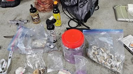 高贵林皇家骑警在周五发布的新闻稿中称,8月 12日警方带着搜查令返回现场,发现了芬太尼、约400克裸盖菇素,以及数量不明的海洛英等毒品。调查人员称,还查获了一把BB枪、几罐防熊喷雾剂,以及自行车、踏板车、运动卡、高档钱包和各种身份证等赃物。