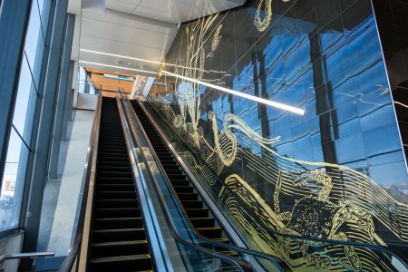该站设置出自本地艺术家Howie Tsui(上图)创作的独特室内外装置艺术,作品描绘菲沙河(Fraser River)河口的水生生物,并且向马斯琴(Musqueam)社群致敬。巨大的镶嵌画覆蓋超过3,600平方呎,并且使用超过3,500块订做的釉面玻璃和金属瓦片制成。(据都市网、图:TransLink)