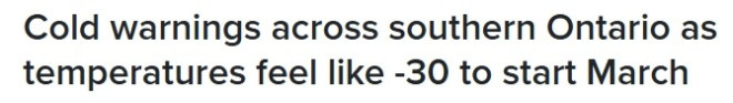 加拿大环境部发布严寒警告,一股极冷空气正席卷安省南部大部分地区,不过多伦多未被列入警告范围。环境部表示,周日夜间至周一早晨,密西沙加、宾顿、旺市、列治文山、万锦、约克区北部以及汉密尔顿等地区,体感温度预计将降至零下25至零下30度之间。