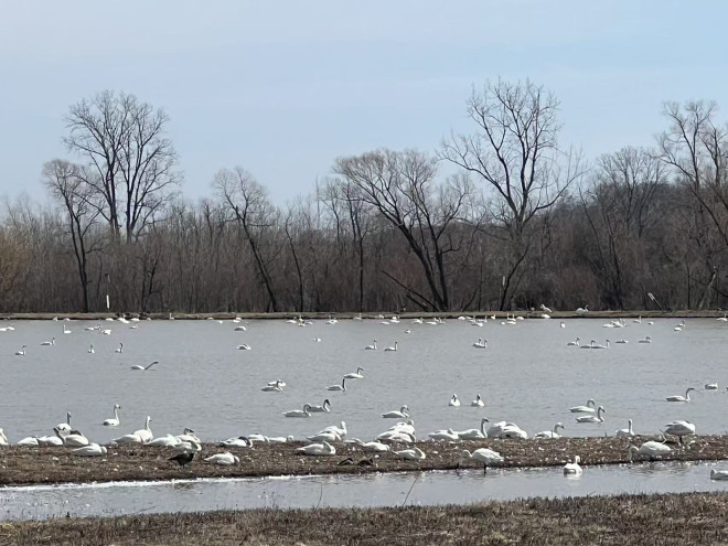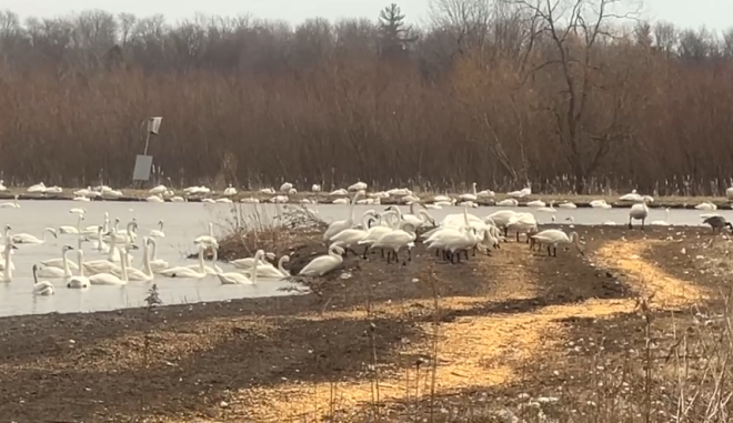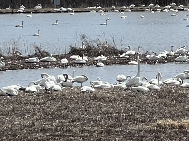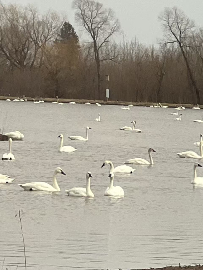 当地志愿者每天在池塘(Tundra Swan Pond)撒玉米,吸引天鹅集中停留。高峰期可达数千只(历史上单日峰值常在3000只左右)。3月25日有1300只,今年最高峰是3月18、19日,每天有2000多只。