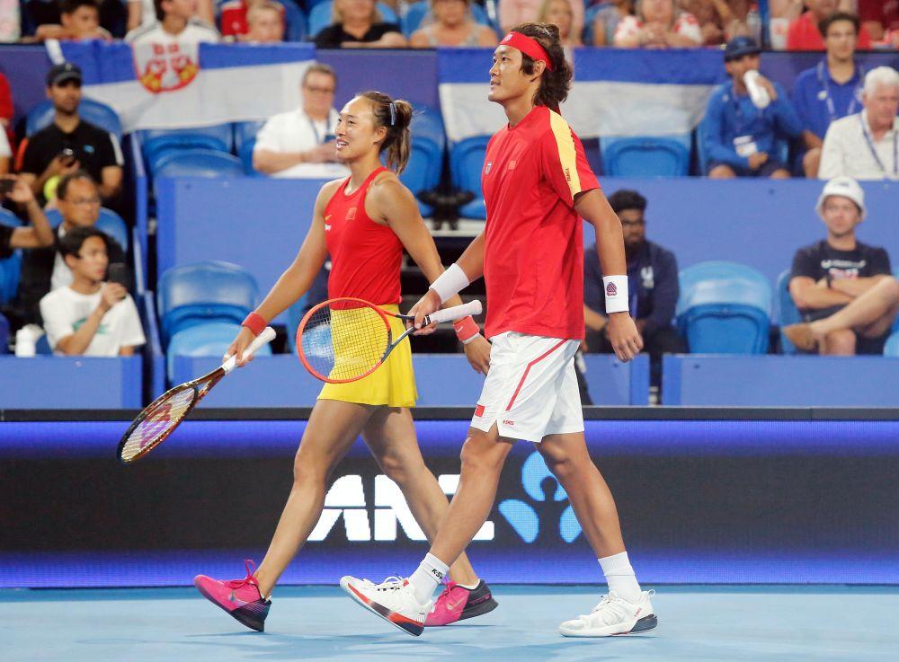 2023年12月31日,中国组合郑钦文/张之臻(右)在2024年网球联合杯E组小组赛中。新华社发(周丹 摄)