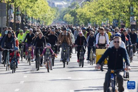 4月20日,在匈牙利首都布达佩斯,人们参加自行车骑行活动。