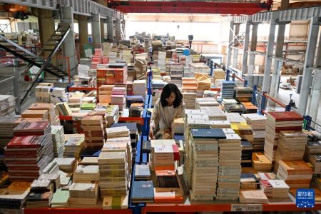 5月11日,在位于河北省涿州市的中图网仓储中心,工作人员在整理图书。