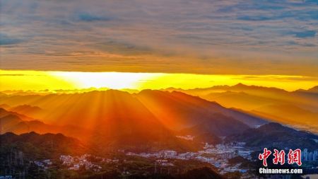 5月28日清晨,杭州淳安旭日东升,千岛湖上空霞光万道,如火的朝霞漫天飞舞,五光十色,绚丽多姿。(
