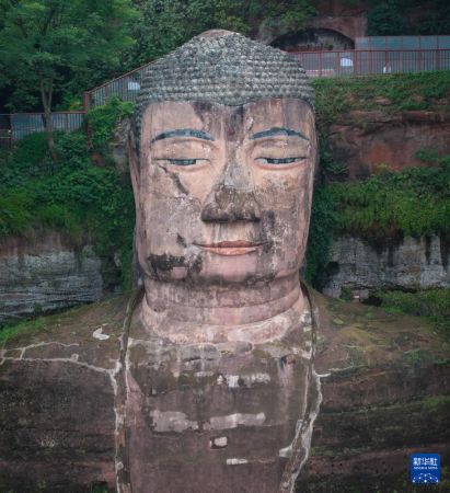 这是乐山大佛局部(6月4日摄,无人机照片)。