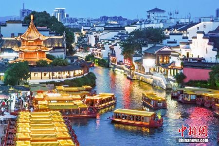 6月10日,江苏南京,游客们乘坐画舫游览秦淮河。当日,中国文化和旅游部发布的信息显示,2024年端午节假期,全国文化和旅游市场总体平稳有序,全国国内旅游出游合计1.1亿人次,同比增长6.3%;国内游客出游总花费403.5亿元人民币,同比增长8.1%。(中新社记者 泱波 摄)