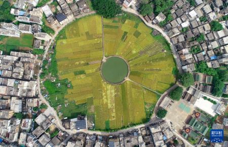 6月12日,收割机在海南省海口市长流镇文毓村的稻田作业(无人机照片)。近期,海南省海口市早稻陆续成熟,当地农民趁着晴好天气开镰收割。