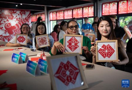 6月8日,在湖北第二师范学院,交流活动成员展示剪纸成果。