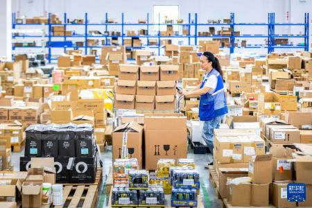 6月18日,在浙江省温州综合保税区京东仓内,工作人员按照订单配送货品。时值电商平台“618”年中促销活动高峰,各地电商、物流等线上线下企业、商家全力应对。