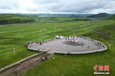 6月28日,航拍塔公草原景区。位于四川省甘孜州康定市塔公镇境内的塔公草原,是海拔3730米的高原地带,国道318川藏公路穿境而过。每当夏秋之际,草原上种类繁多的野花竞相绽放,吸引游人徜徉其中。(中新社记者 王磊 摄 无人机照片)