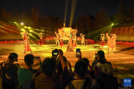 9月30日,在金沙遗址博物馆,观众观看“夜游金沙·穿越古蜀——博物馆情景式导览演出秀”。