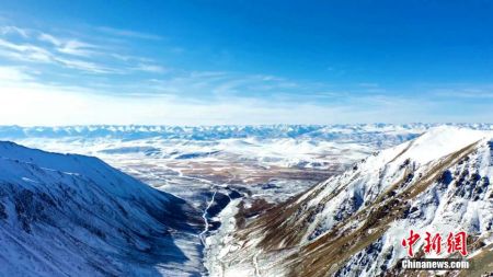 时值初冬,青藏高原已是一幅深冬景象。位于祁连山腹地的青海省海北藏族自治州门源县境内,大地被大雪覆盖,干净如初,浩门河蜿蜒着穿境而过。祁连山脉东段最高峰岗什卡雪峰和七彩瀑布宛若大自然雕琢的艺术品,在阳光的照耀下闪烁着光芒。图为祁连山腹地被冬日暖阳照射。