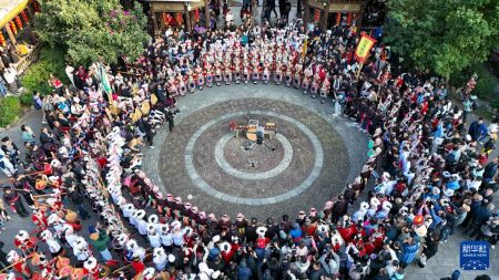 11月30日,侗族群众在黎平县肇兴侗寨进行文艺表演(无人机照片)。