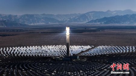 12月8日,位于青海省海西蒙古族藏族自治州格尔木市的鲁能海西州多能互补集成优化国家示范工程。该项目于2017年7月开工建设,2019年9月全部并网发电,总装机容量70万千瓦,其中20万千瓦光伏项目、40万千瓦风电项目、5万千瓦光热发电项目及5万千瓦储能项目,是世界上首个集风光热储调荷于一体的多能互补科技创新项目。截至2023年底,青海省的清洁能源发电装机容量为5109万千瓦,占总装机容量的92.9%,是中国新能源装机占比最高的省份。图为太阳能光伏板与定日镜。(无人机图片 中新社记者 薛蒂 摄)