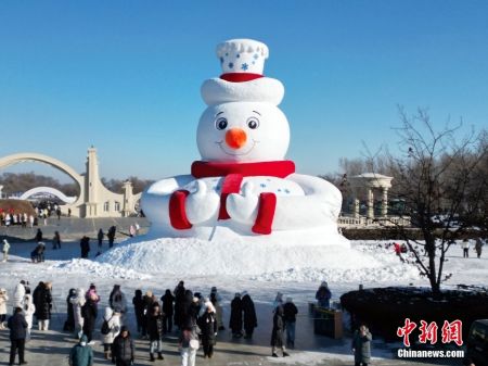 12月8日,哈尔滨市今年冰雪季首个建成的大型雪雕——第37届太阳岛雪博会“雪人先生”亮相迎客。这座高达20米、用雪量达4000立方米的巨型雪雕,以标志性的雪花礼帽、红色围脖和可爱的面容,展现了雪雕艺术的热情与活力。(图/视觉中国)