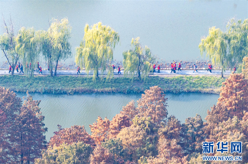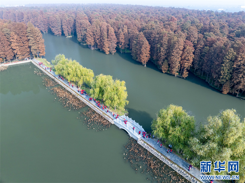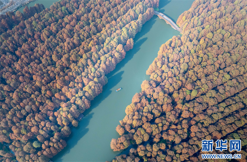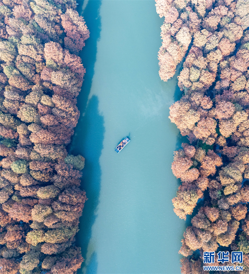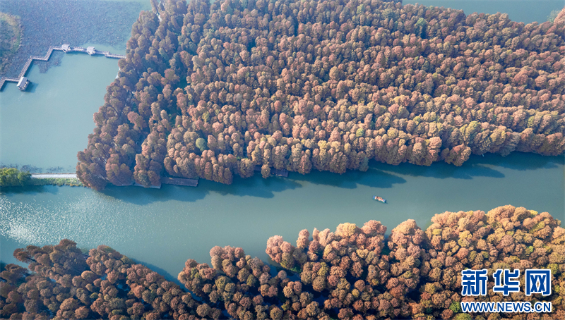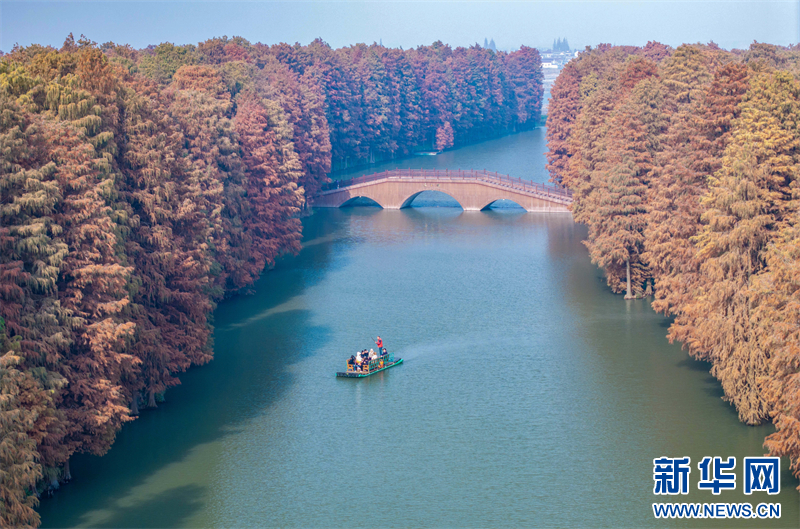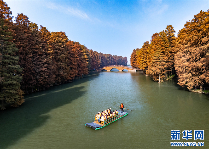 初冬时节,中国江苏兴化里下河国家湿地公园层林尽染,碧水与池杉相映成趣,宛如一幅水彩画,吸引众多游客前来游览。(沙佳仪 周社根)