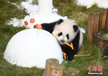 12月28日,重庆动物园为大熊猫“好奇”的幼崽“三妹”举行半岁庆祝活动。据悉,大熊猫“好奇”于2024年6月28日顺利产下大熊猫幼崽,已满6个月,大熊猫宝宝出生以来,由大熊猫妈妈“好奇”自己哺育,饲养员仅进行适当人工辅助,如今长势良好体重达12kg。图为半岁大熊猫“三妹”在户外玩雪吃美食。