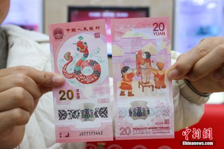 1月3日,贵州贵阳,市民在中国工商银行一支行展示纪念钞。当日,由中国人民银行发行的2025年贺岁纪念钞开始兑换。纪念钞面额20元,票面长145毫米,宽70毫米,采用塑料材质,发行数量为1亿张。