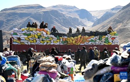 1月9日,受灾群众在措布村卸载救灾物资。日喀则市拉孜县拉孜镇措布村处于定日县“1·07”地震重灾区。地震当天,村里群众就全部住进防灾帐篷。1月9日,包括帐篷、火炉、食品在内的大量救灾物资抵达措布村,由西藏自治区森林消防总队派出的救援队伍也抵达该村,协助派发物资、搭建帐篷,保证受灾群众得到妥善安置。