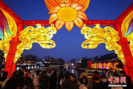 1月16日傍晚,江苏南京,民众在秦淮河文德桥上欣赏景致。春节将至,南京秦淮河畔彩灯璀璨。(