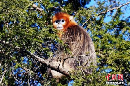 在位于四川省阿坝藏族羌族自治州九寨沟县境内的四川白河国家级自然保护区里,生活着约1700只野生川金丝猴,这些面颊呈淡蓝色,全身金黄、毛发油亮的川金丝猴在层峦叠翠的山林峡谷玩耍,动作轻盈、萌态十足。图为1月16日,野生川金丝猴萌态十足。(中新社记者 安源 摄)