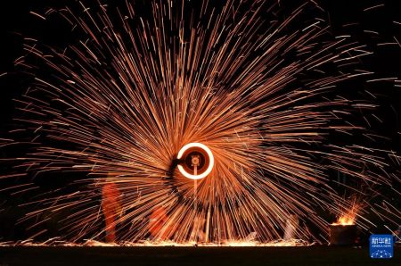 2月1日,民间艺人在浙江省金华市武义县花田美地景区表演打铁花。