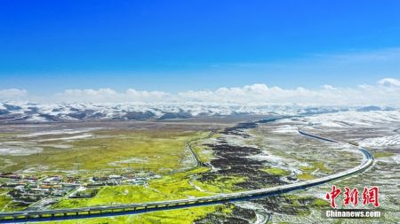 久马高速与连绵雪山同框 似巨龙穿梭广袤草原