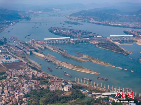 3月12日,广西梧州市长洲水利枢纽西江船闸货船来往穿梭,运载生产生活物资有序过往船闸,一派繁忙。(