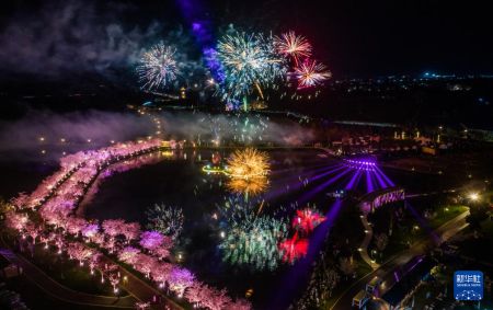 空中俯瞰花田美地景区的烟花秀(无人机照片,3月25日摄)。