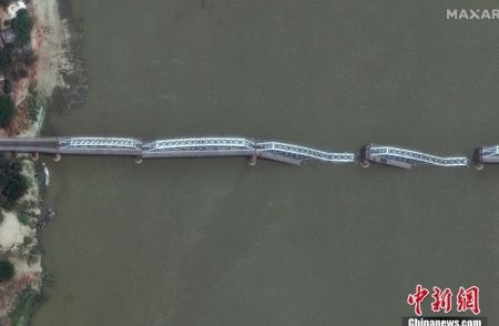 图为当地时间2025年3月29日卫星所拍摄到的缅甸曼德勒一桥梁遭地震损毁,断成多段。