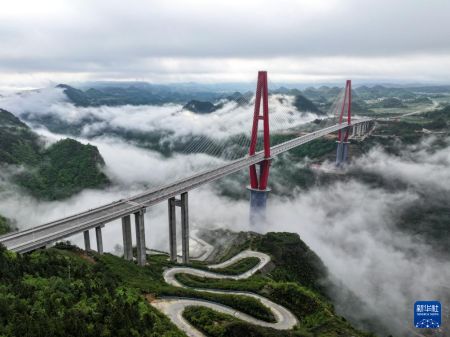 当日,一场春雨过后,贵州省龙里县的龙里河大桥周边出现云海景观,晨曦中的大桥仿佛飞架于云端之上,蔚为壮观。龙里河大桥全长1260米,主桥及塔柱设计有观光旅游玻璃栈道、全景观光电梯等旅游设施,是贵州探索“桥旅融合”打造的新“网红”景点。