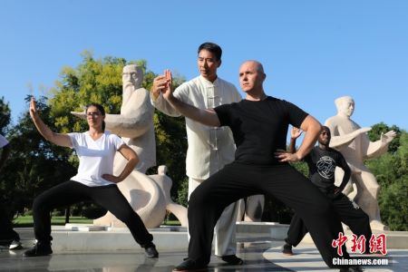 在河南省焦作市温县陈家沟太极十三式雕塑广场,著名太极拳师陈炳在指导外籍学员习练太极拳。(据中新网)