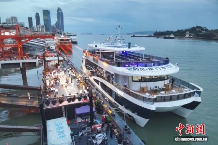 7月25日晚,中国首艘纯电海上旅游客船“屿见77”轮在福建厦门和平码头正式开启首航。“屿见77”轮总长49米、宽14.5米,额定载客358人,搭载两台450千瓦推进电机,最大航速20km/h,续航里程达45海里,兼具海上休闲娱乐、游览观光、会议和餐饮功能,是中国首艘入级中国船级社的纯电海上客船。(无人机照片 中新社发 厦门海事 供图)