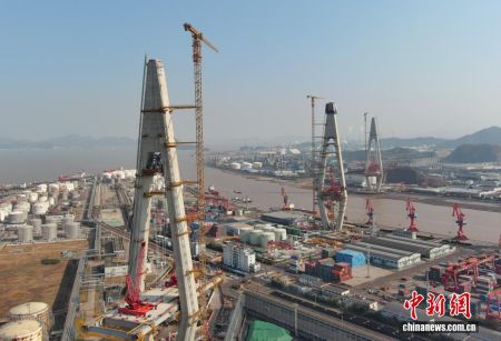 12月18日,航拍甬江入海口的甬江特大桥三座主塔。当日,位于浙江宁波的杭甬复线宁波三期项目关键控制性工程——甬江特大桥P59主塔顺利封顶,标志着世界上最大跨径的三塔不对称斜拉桥的三座主塔全部实现封顶。杭甬复线宁波三期项目是国家高速公路杭甬高速复线的重要组成部分,甬江特大桥建成后将串联镇海港区、北仑港区及杭州湾南岸产业带,成为宁波舟山港集疏运体系的关键枢纽。(无人机照片 中新社记者 王刚 摄)