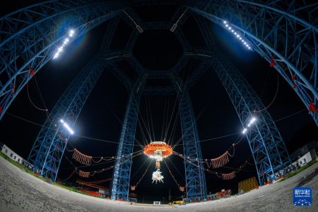 2025年8月6日,揽月月面着陆器着陆起飞综合验证试验在位于河北省怀来县的地外天体着陆试验场圆满完成,标志着我国载人月球探测工程研制工作取得新的重要突破。这是揽月月面着陆器在地外天体着陆试验场进行测试(资料照片)。