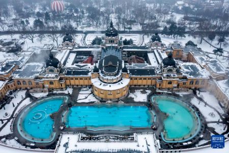 这是1月16日在匈牙利布达佩斯拍摄的雪后塞切尼温泉(无人机照片)。