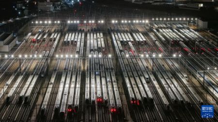 这是1月25日凌晨在昆明车辆段昆明南动车运用所拍摄的动车组列车(无人机照片)。