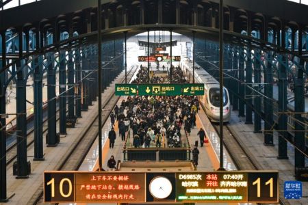 2月2日,旅客在哈尔滨火车站乘车出行。