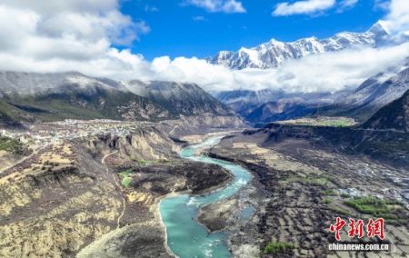 3月18日,春分临近,在西藏自治区林芝市米林市派镇索松村的雅鲁藏布大峡谷,雅鲁藏布江碧波荡漾,江畔春花盛开,生机盎然,绘就“雪域江南”一幅生态山水春日胜景长卷。(