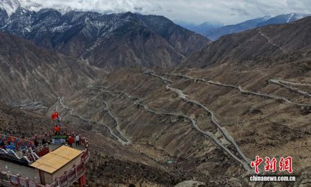 3月25日,游客在川藏线“天路72拐”观景台拍照。位于西藏昌都市川藏公路线上的“天路72拐”,全长仅30多公里,高差却达1800余米。因坡陡弯急、地势险峻成为川藏公路上极具视觉冲击力的打卡点,吸引过往游客在观景台驻足打卡拍照。(无人机照片 中新社记者 李林 摄)