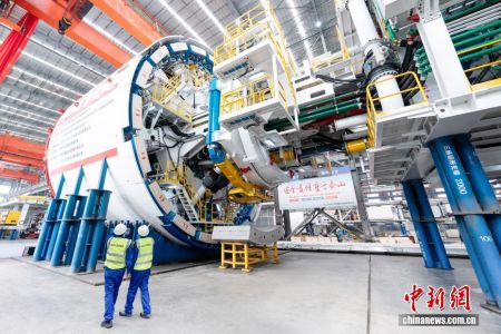 3月31日,江苏南通,由中国铁建打造的一台国产14米级超大直径盾构机“奋楫号”顺利下线,将被用于新建盐城经泰州无锡常州至宜兴高铁长江隧道工程。该工程是国内首条采用承插式管片的高铁盾构隧道,隧道的建设将推动我国超大直径水下盾构隧道向全智能建造时代迈进。据了解,针对长江隧道盾构掘进特点,“奋楫号”盾构机整机全长145米,总重约3800吨,刀盘开挖直径14.33米,搭载了多项智能化装置,实现开挖面可视、主驱动状态可检、刀盘刀具磨损可知、管片壁后同步注浆跟随可测、地质情况超前可报等多系统协同运作。同时还集成了远程掘进驾驶、关键部件实时监测、管片箱涵智能拼装的整体性功能,将推动实现“智能掘进、智能拼装、高效成型”的一体化、全智能建造新模式。图为中铁十四局监造人员对盾构机整机进行验收。(林凤 摄)